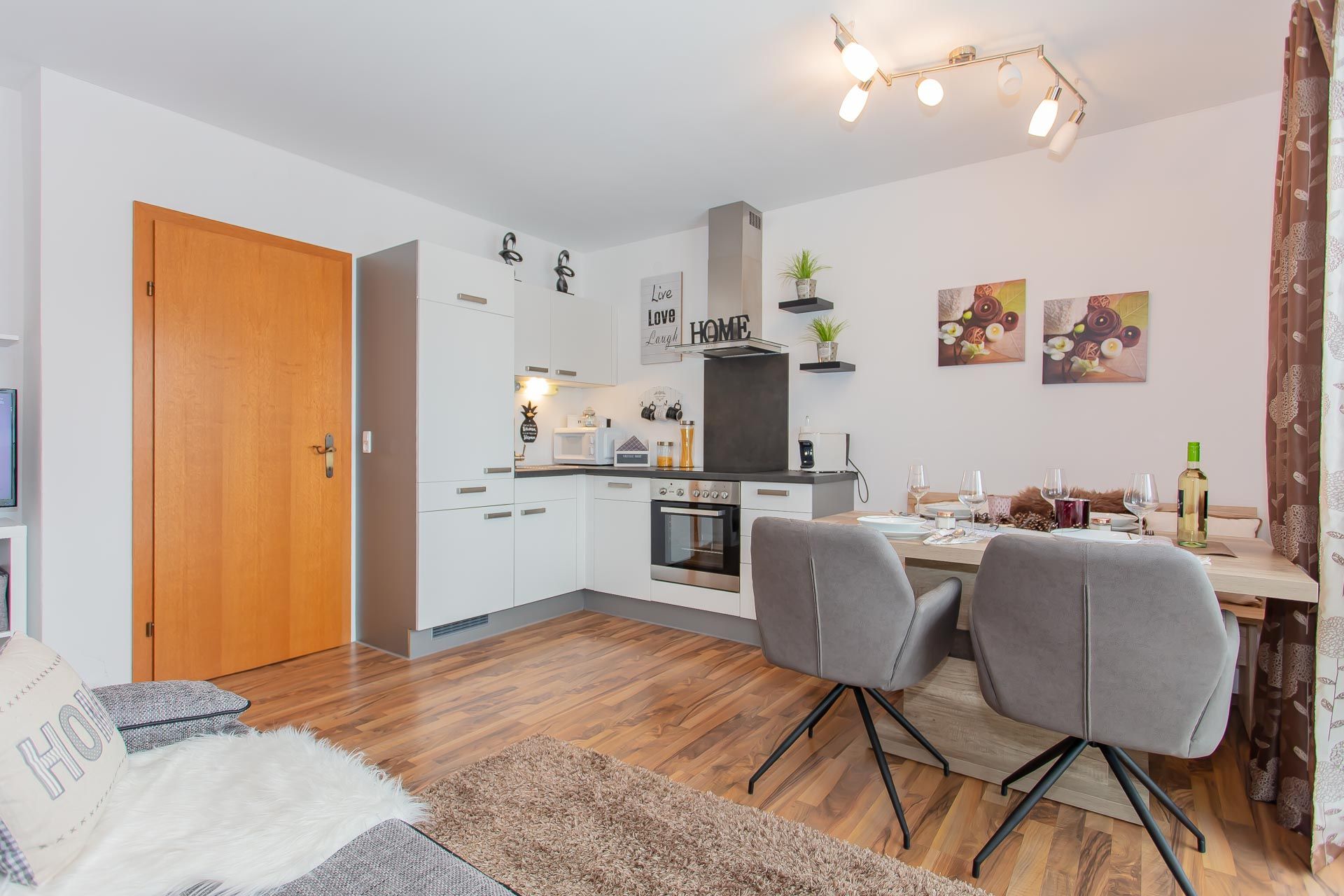 - komplett ausgestattete Wohnküche mit 4-Platten Cerankochfeld inkl. Backofen, Geschirrspüler, Kühlschrank mit kleinem Gefrierfach, Mikrowelle, Wasserkocher, Kaffeemaschinen (Tabs und Filter), Toaster, Eierkocher